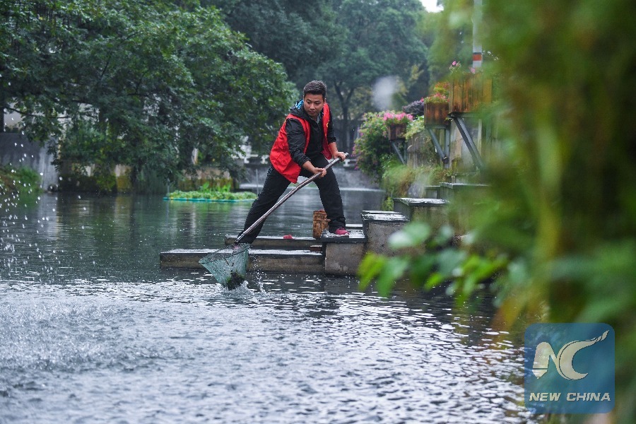 River chief Wang Jia clears away floating waste on a river in Changxing County, east China's Zhejiang Province, Oct. 12, 2017. (Xinhua/Xu Yu)