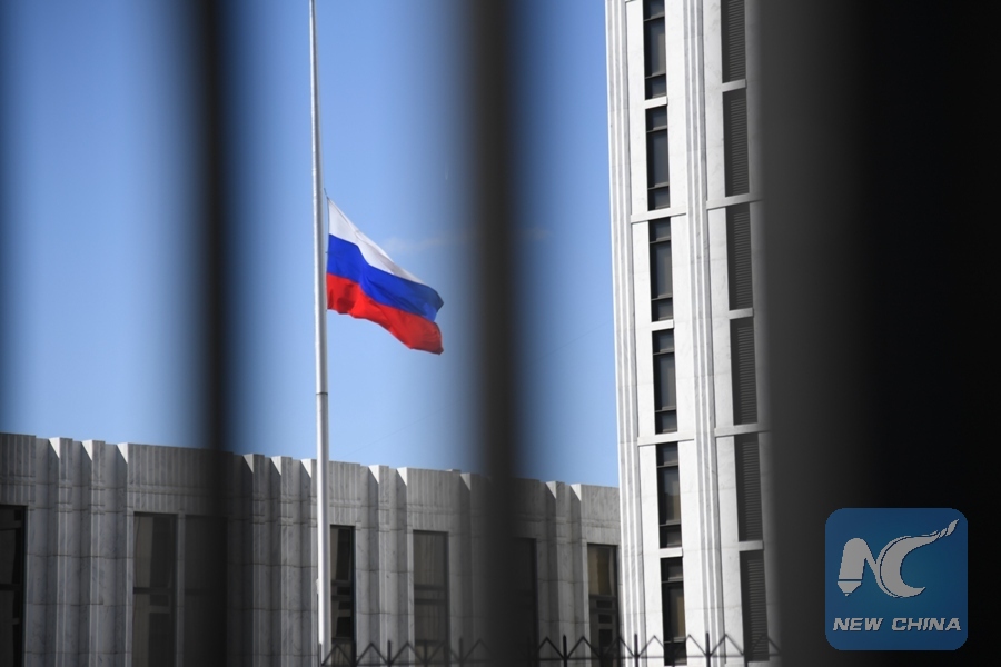Photo taken on March 26, 2018 shows the Russian national flag at Embassy of Russia in Washington D.C., the United States. (Xinhua/Yang Chenglin)