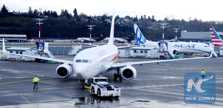 The 9999th Boeing737-800 aircraft prepares to take off from the company's Seattle airfield in the state of Washington, the United States, March 24, 2018. (Xinhua/Wu Xiaoling)