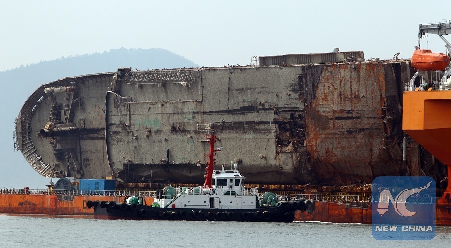 File Photo: The remains of sunken South Korean passenger ferry Sewol arrives at a port in Mokpo, some 90 km away from the Jindo Island, South Korea, March 31, 2017.