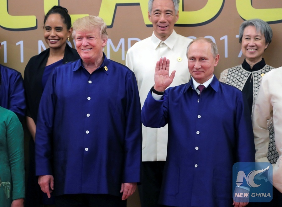 File Photo: U.S. President Donald Trump and Russian President Vladimir Putin take part in a family photo at the APEC summit in Danang, Vietnam Nov. 10, 2017. (Xinhua/REUTERS)
