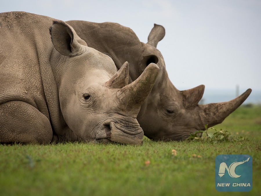 Photo taken on March 30, 2018 shows Fatu (L), one of the world's last two remaining female northern white rhinos, in Ol Pejeta Conservancy in Laikipia county, northern Kenya. Kenyan wildlife officials and global wildlife conservationists on Saturday converged at Ol Pejeta Conservancy in northern Kenya where a memorial service for the late world's only remaining male northern white rhino fondly named Sudan took place. (Xinhua/Lyu Shuai)