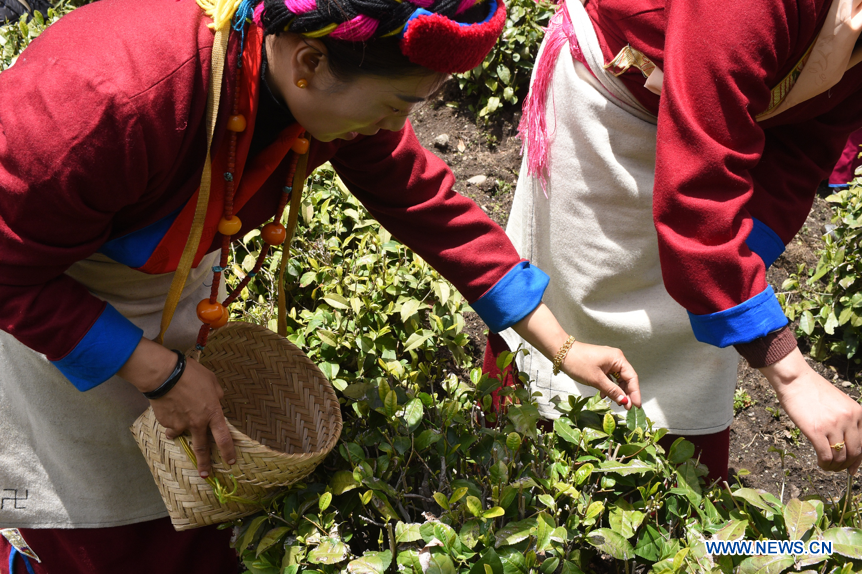 Members of tea farmers and herdsmen professional cooperative pick tea leaves in a tea garden in Le Menba Ethnic Township of Cuona County in Shannan, southwest China's Tibet Autonomous Region, May 12, 2018. The tea cooperative was founded in 2011. In 2017, the income per capita of the township increased by about 12,000 yuan under the cooperative. Tea industry has now become one of the most important driving forces of local economy. (Xinhuanet/Chen Lin)