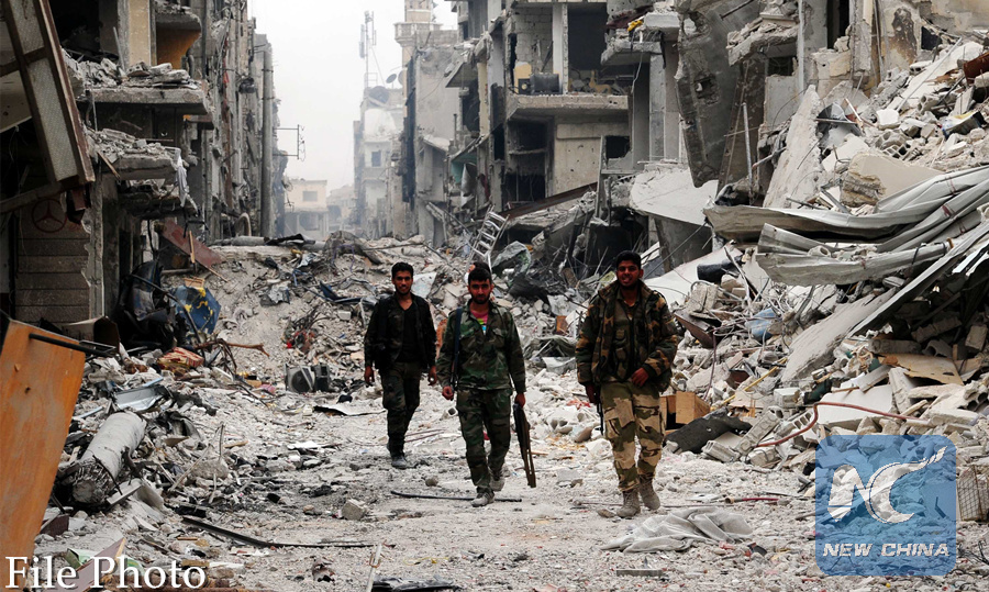 Syrian soldiers are seen in the largely destroyed Hajar al-Aswad district, south of Damascus, Syria, on May 22, 2018. (Xinhua/Ammar Safarjalani)
