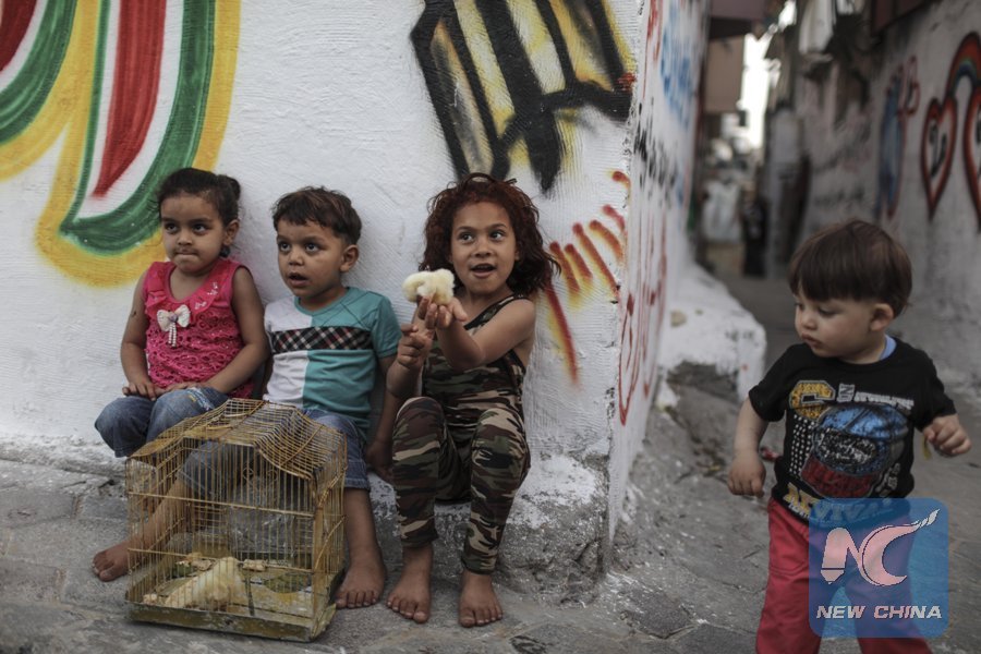 Palestinian children react in the Jabalia refugee camp, in the northern Gaza Strip, on May 14, 2017. (Xinhua/Wissam Nassar)