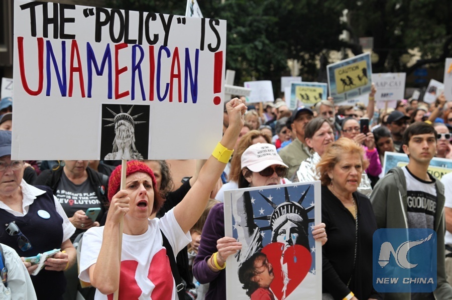 File Photo: People take part in the "Families Belong Together" protest in San Diego, the United States, on June 23, 2018. Thousands of people marched in protest in the U.S.-Mexico border city of San Diego, raising slogans against the Trump administration's policy of separating children from immigrant parents. (Xinhua/Gao Shan)