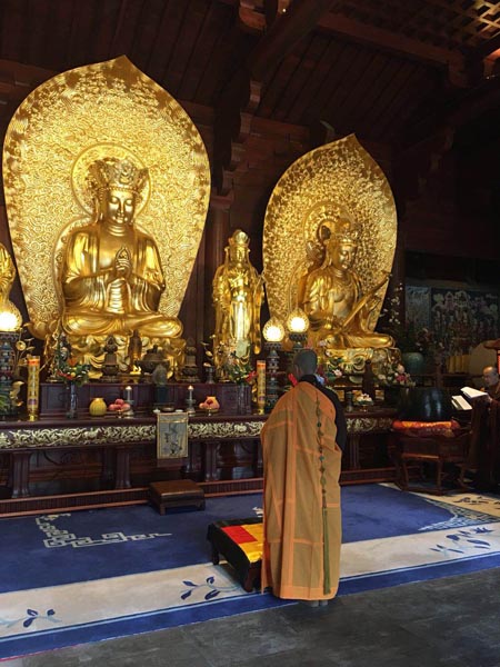 The original temple was first built in the dynasty's Zhenyuan era (785-804), yet it suffered complete destruction due to religious persecution by Emperor Wuzong of Tang starting in 842. Before World War II, the temple underwent a restoration, during which around 10,000 Buddha statues hidden from Wuzong were found, giving the temple the name Wanfo Cave (wanfodong in Chinese). After that, the temple gradually declined and only the cave, where more than 10,000 Buddha statues were found, and a five-story hexagonal pagoda remain. This Wanfodong Zhenrong Temple started reconstruction on that site, closely abiding by ancient Chinese construction rules.