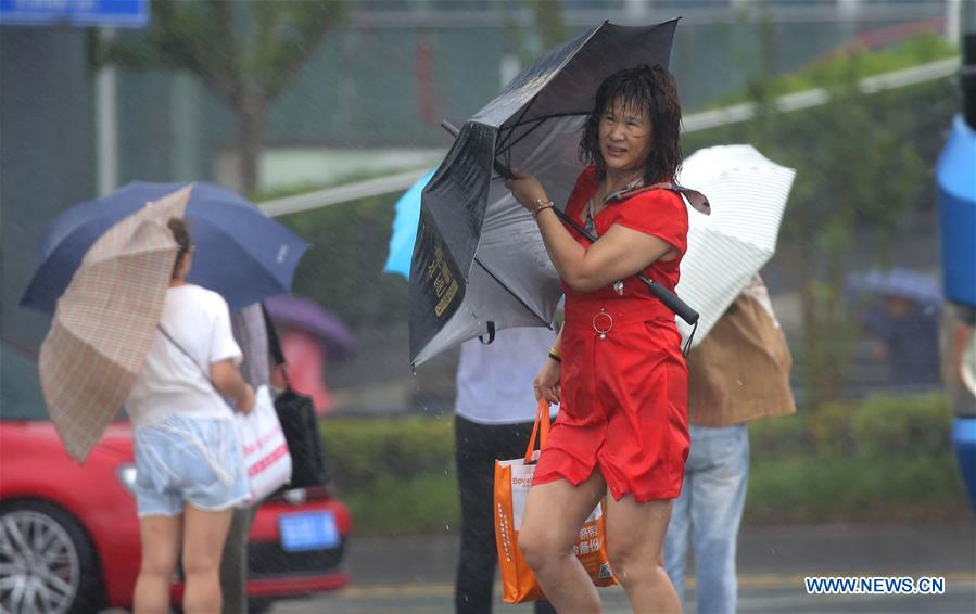 Citizens walk against strong wind and rain on a street in Lianyungang City, east China's Jiangsu Province, July 23, 2018. Ampil, this year's 10th typhoon, brought heavy rain to Lianyungang on Monday. (Xinhua/Wang Jianmin)