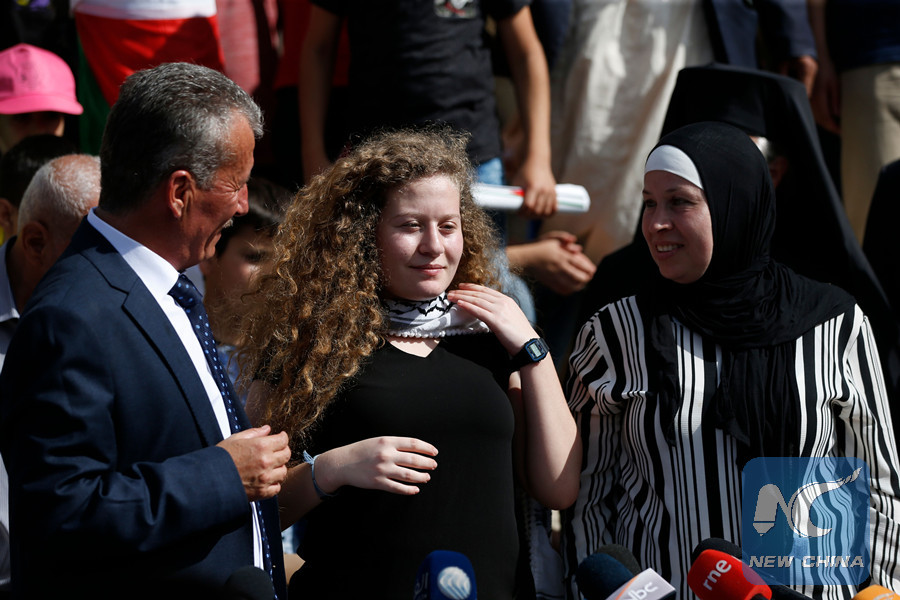 Her father told Xinhua that he "feels happy today" as a father, promising "that the message and actions of peaceful resistance against the occupation will continue despite what the Israelis are trying to do to destroy our happiness."