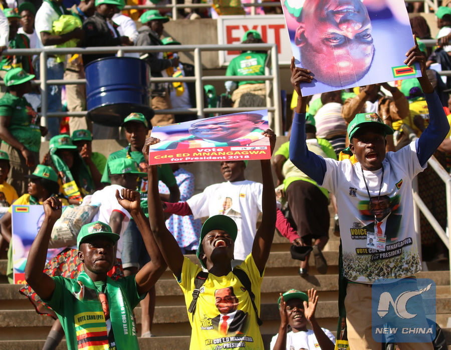 Photo shows supporters join a rally by ruling party ZANU-PF in National Stadium in Harare, Zimbabwe, July 28, 2018. (Xinhua/Shaun Jusa)