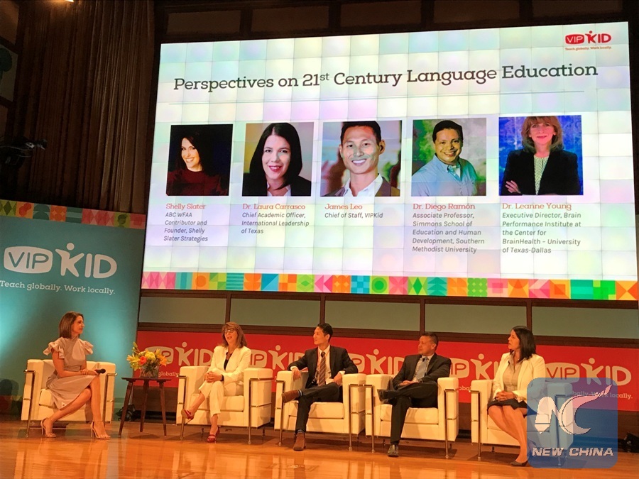 Panel discussion on online English teaching and leaning in the conference. More than 300 VIPKID teachers who gathered Wednesday for the company's second regional conference in Dallas, the U.S. state of Texas. (Xinhua/Gao Lu)