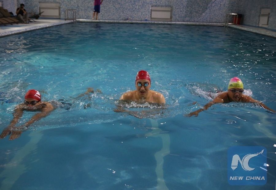 An Afghan swimmer, Ali Asghar Nazari(C) exercise at a swimming pool in Kabul, capital of Afghanistan, August 9,2018. (Xinhua/Rahmat Alizadah)