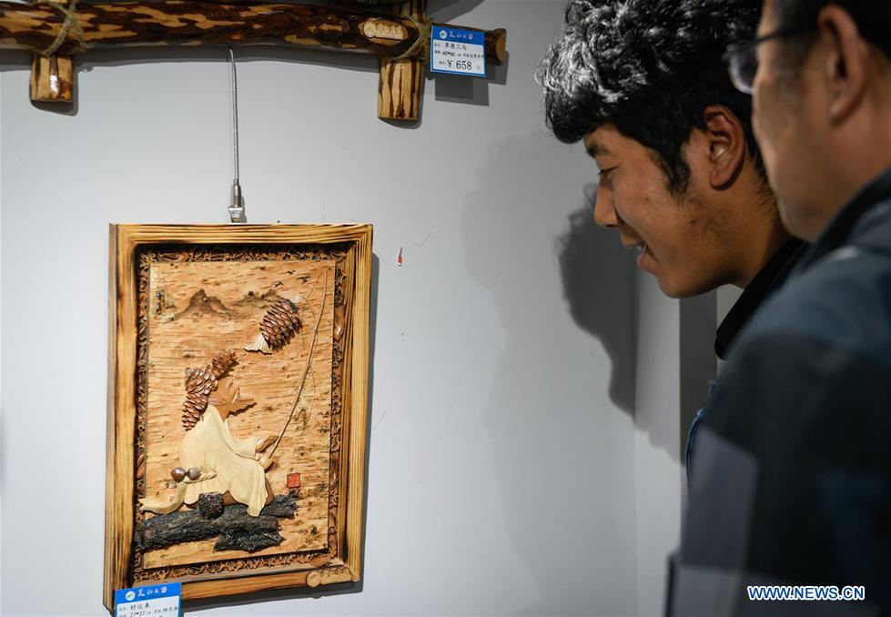Citizens view an artwork made of wood pieces in Xigaze, southwest China's Tibet Autonomous Region, Aug. 26, 2018. An exhibition on intangible cultural heritages of Heilongjiang Province kicked off in Xigaze Sunday. (Xinhua/Liu Dongjun)