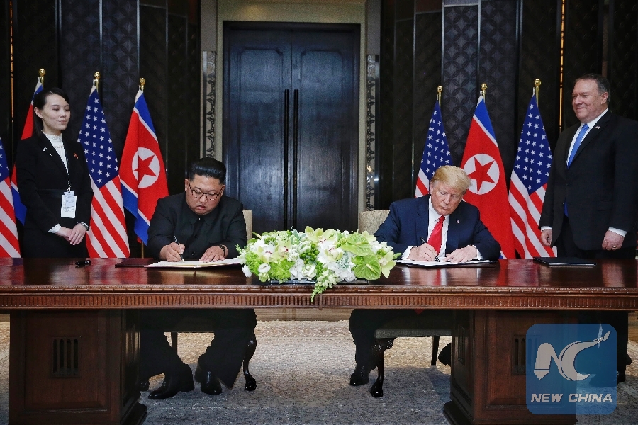 File Photo: Top leader of the Democratic People's Republic of Korea (DPRK) Kim Jong Un (2nd L) and U.S. President Donald Trump (2nd R) sign a joint statement in Singapore on June 12, 2018. (Xinhua/Ministry of Communication and Information of Singapore)