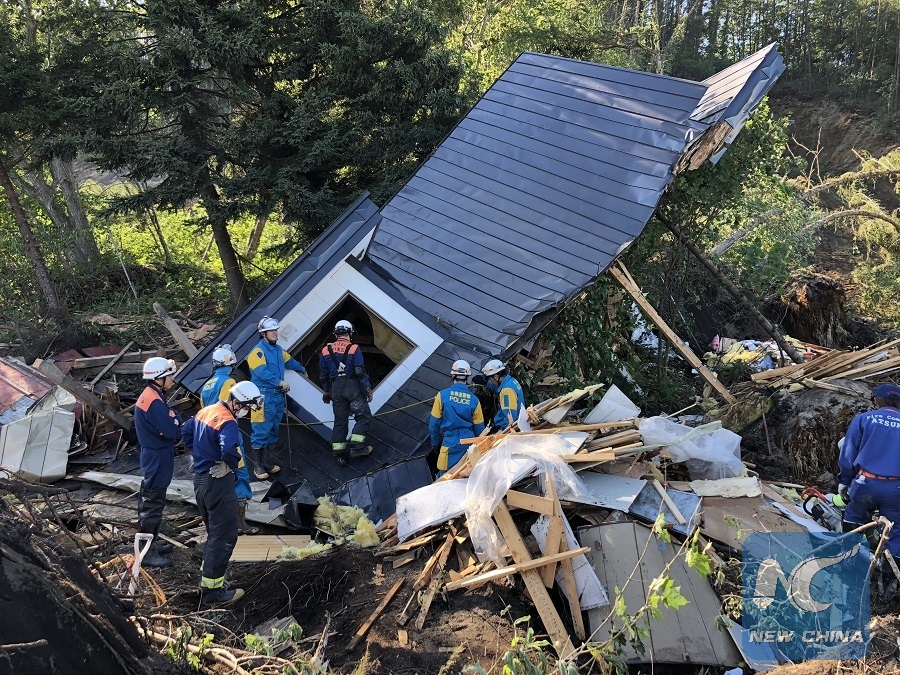 Rescuers work at a collapsed house after an earthquake in the town of Atsuma, Hokkaidoprefecture, Japan, on Sept. 6, 2018. (Xinhua/Deng Min)