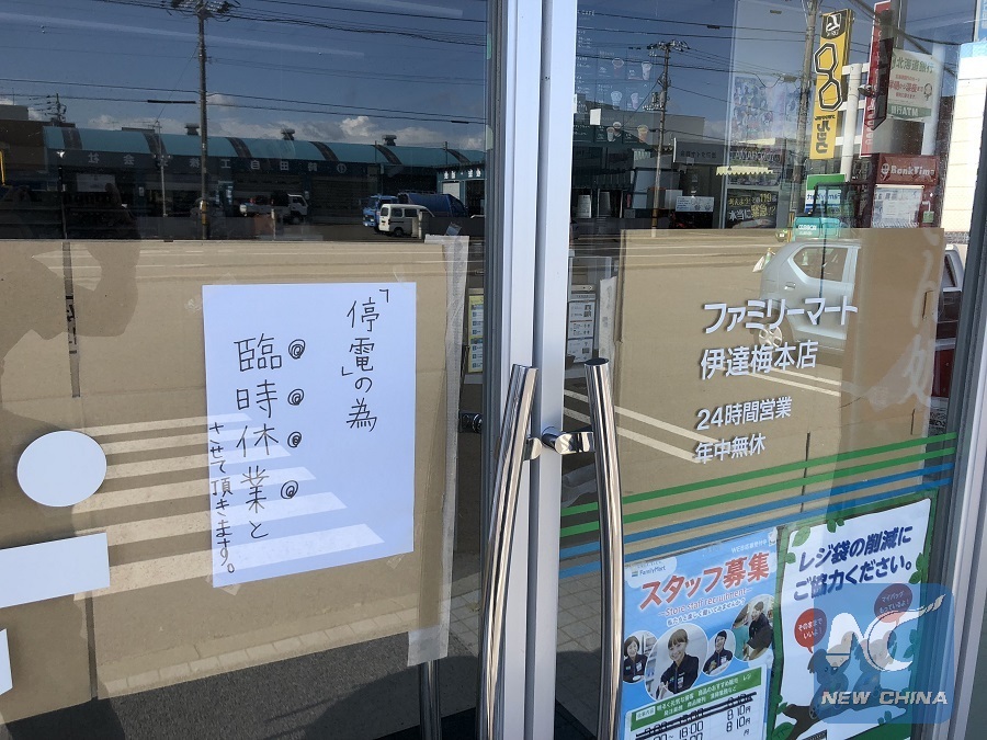 A sign reading "Service suspended due to power failure" is posted on the entrance of a convenience store after an earthquake in Date, Hokkaido, Japan, on Sept. 6, 2018. (Xinhua/Deng Min)