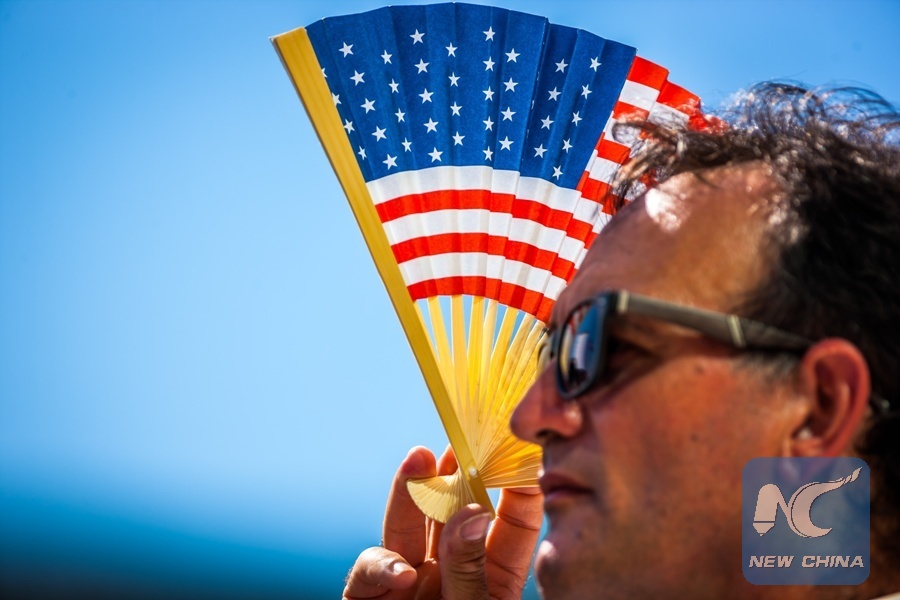 File Photo: A journalist shades from sunshine with a U.S. flag fan during the flag-raising ceremony at the U.S. embassy in Havana, Cuba, Aug. 14, 2015. U.S. Secretary of State John Kerry chaired here the formal ceremony of raising the American flag in the recently reopened U.S. embassy in Cuba, after 54 years of animosity between the two neighbors. (Xinhua/Liu Bin)