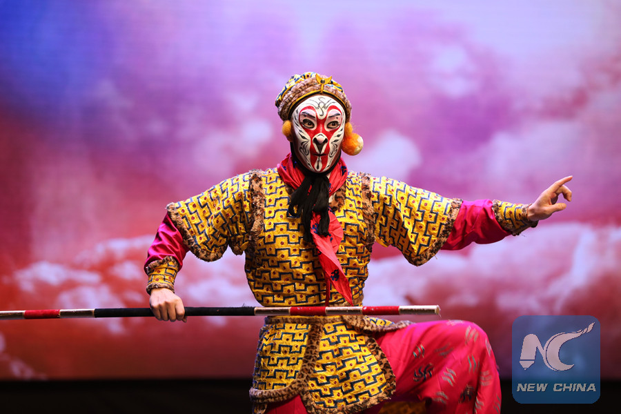 A Chinese artist from the China National Peking Opera Company performs the show of Havoc in Dragon Palace in the Cultural Palace of the city of Ramallah, on Sept. 19, 2018. (Xinhua/Zhao Yue)