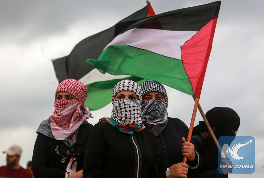 File Photo: Palestinian women hold flags as they clash with Israeli troops near the border with Israel, in the northern Gaza Strip, on Oct. 1, 2018. (Xinhua/Stringer)