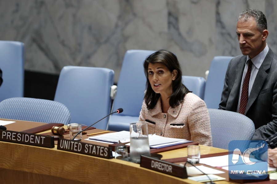 U.S. ambassador to the United Nations (UN) Nikki Haley (L) speaks at a Security Council meeting on the situation in Syria's Idlib province at the UN headquarters in New York, on Sept. 11, 2018. (Xinhua/Li Muzi)