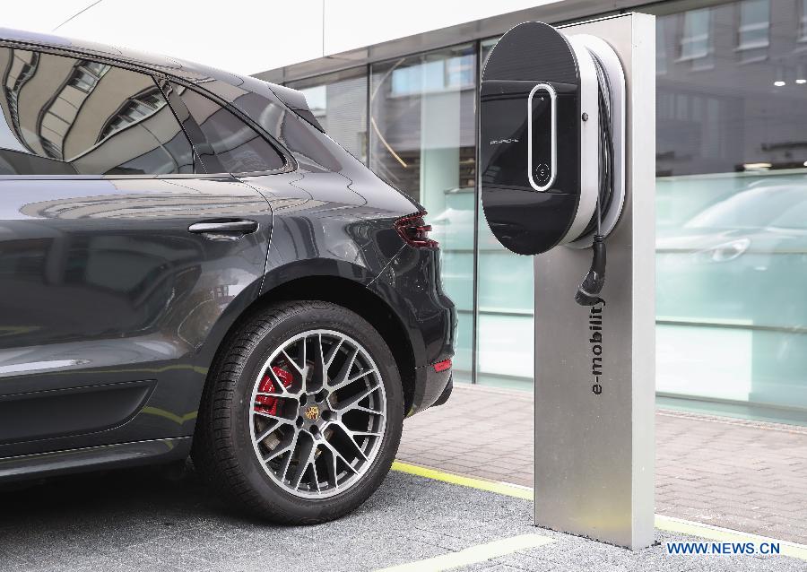 Photo taken on Oct. 9, 2018 shows a charging pile at Porsche Center in Berlin, Germany. (Xinhua/Shan Yuqi)
