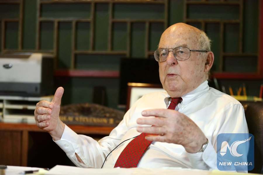 Adlai Ewing Stevenson III, former Illinois senator, speaks during an exclusive interview with Xinhua in Chicago, the United States, on July 16, 2018. (Xinhua/Wang Ping)