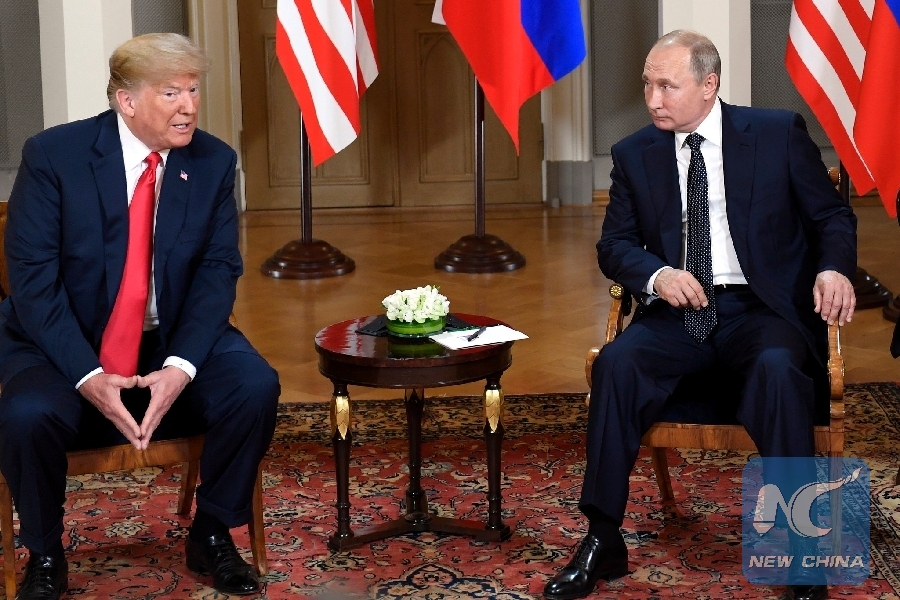 File Photo: U.S. President Donald Trump (L) meets with his Russian counterpart Vladimir Putin in Helsinki, Finland, on July 16, 2018. U.S. (Xinhua/Lehtikuva/Heikki Saukkomaa)