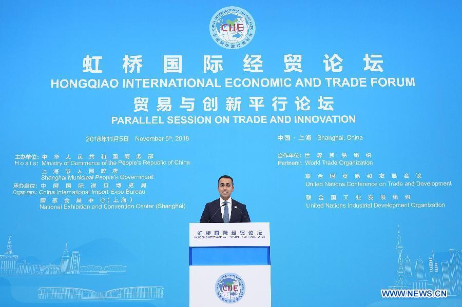 Luigi Di Maio, deputy prime minister of Italy, speaks at the Parallel Session on Trade and Innovation of the Hongqiao International Economic and Trade Forum in Shanghai, east China, Nov. 5, 2018. (Xinhua/Shen Bohan)