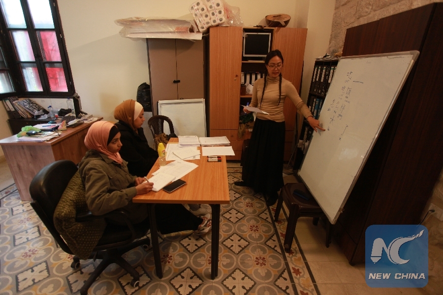 NABLUS, West Bank, Nov. 12 (Xinhua) -- Walking through the narrow alley ways of the old city of Nablus up to an old building now serving as a community center, two young college students were attending a Mandarin Chinese language course.