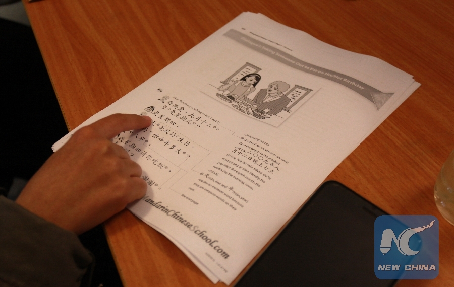 A Palestinian college student attends a Mandarin Chinese language course, by teacher Alicia Stickney, in the west bank city of Nablus, on Nov. 11, 2018. (Xinhua/Nidal Eshtayeh)