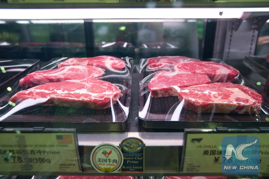 File photo taken on Nov. 3, 2017 shows beef imported from the United States, at a supermarket in Shanghai, east China. (Xinhua/Meng Dingbo)