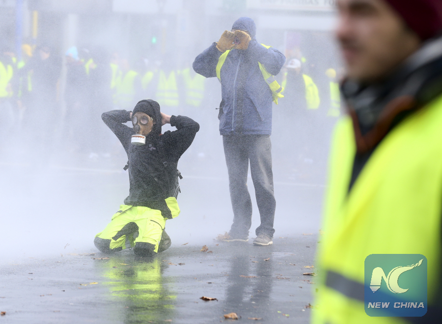 Riot police use water canon during clashes at a demonstration by the "Yellow Vest" protesters in Brussels, Belgium, on Dec. 8, 2018. (Xinhua/Ye Pingfan)