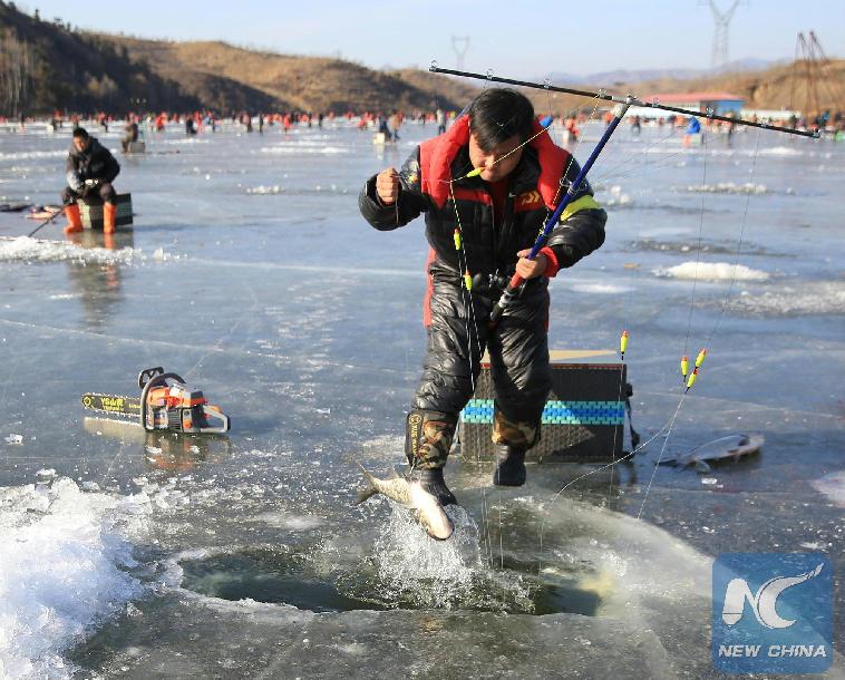 People fish on the ice at the Heiwa village reservoir in Qianxi County, Tangshan City of north China's Hebei Province, on Jan. 2, 2019. The "ice-fishing" has been great fun for local residents here. (Xinhua/Wang Aijun) XINHUA PHOTOS OF THE DAY