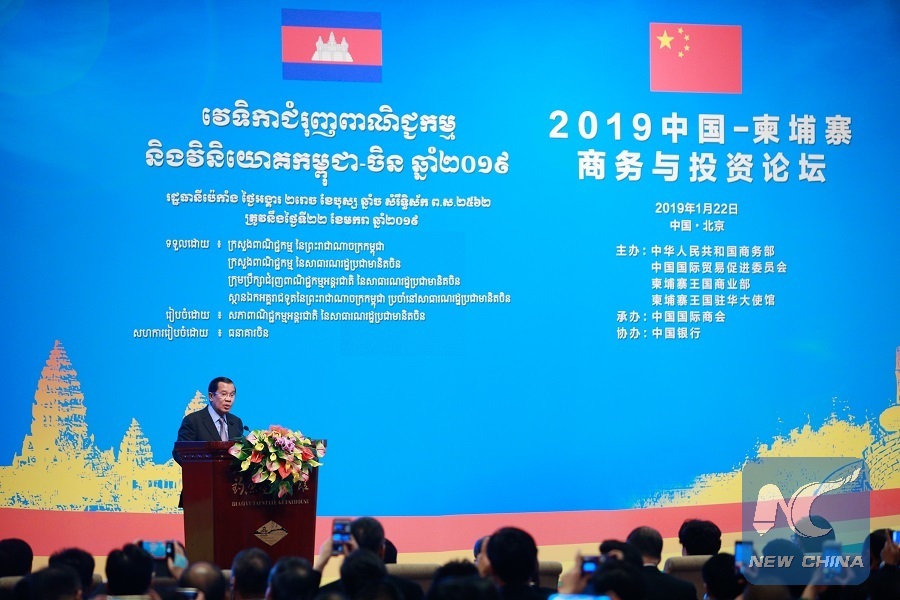 Cambodian Prime Minister Samdech Techo Hun Sen addresses the opening ceremony of the China-Cambodia Trade and Investment Promotion Forum 2019 in Beijing, capital of China, on Jan. 22, 2019. (Xinhua/Liu Bin)