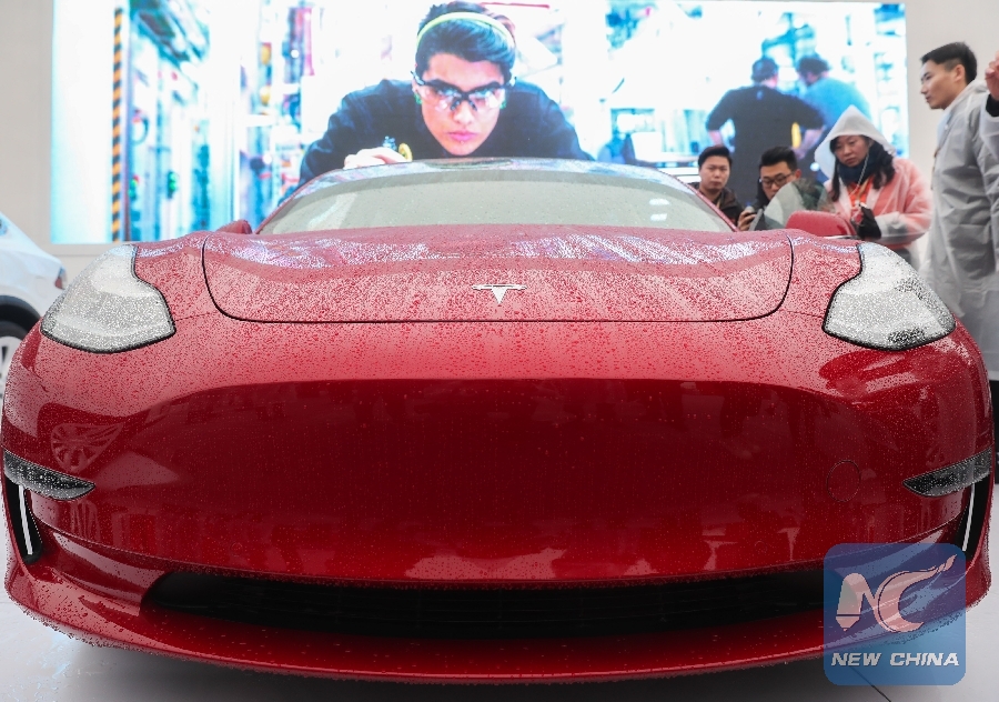File Photo: A Tesla Model 3 is displayed at the groundbreaking ceremony of Tesla Shanghai Gigafactory in Shanghai, east China, Jan. 7, 2019. (Xinhua/Ding Ting)