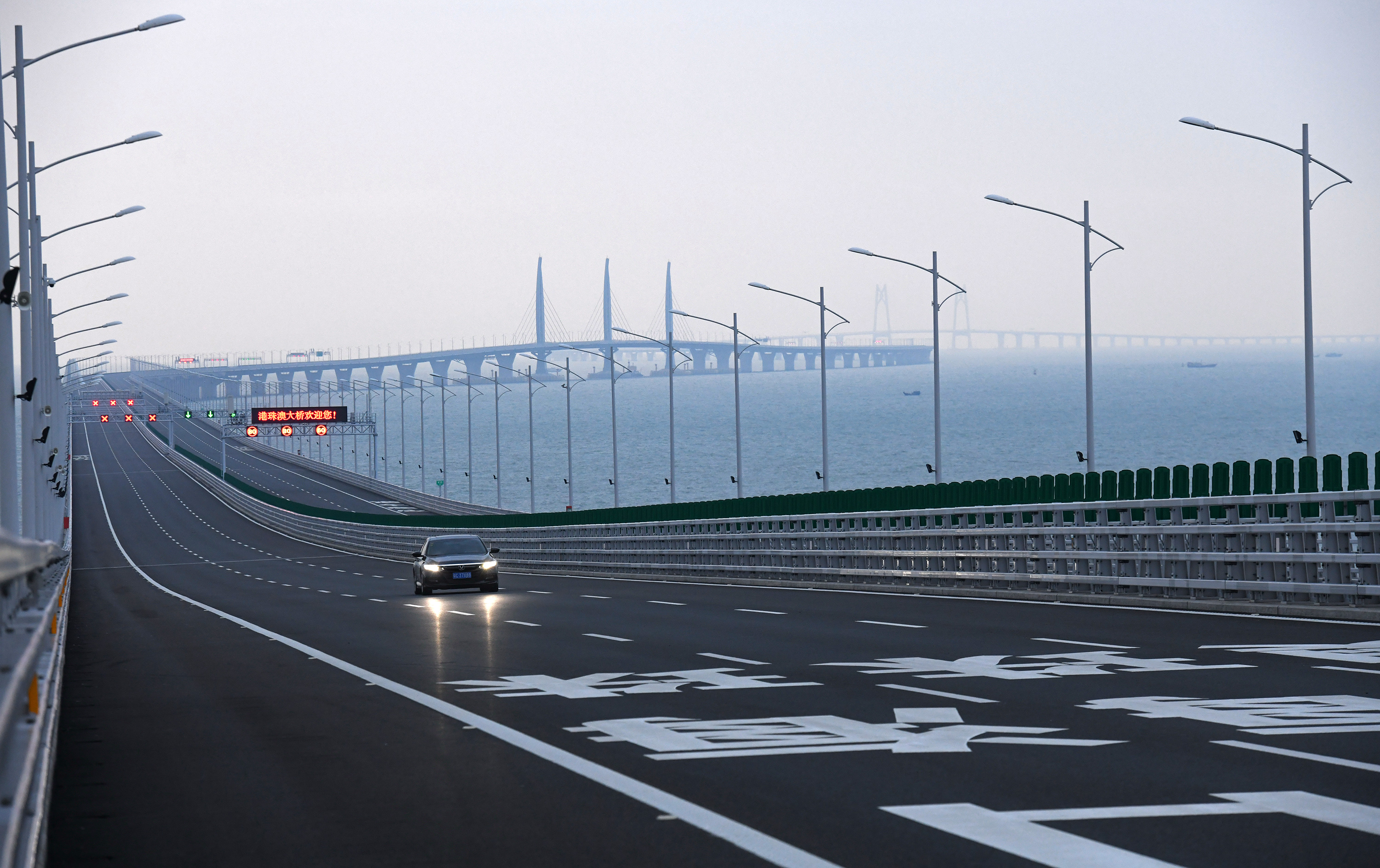 Photo taken on Oct. 20, 2018 shows a car driving on the Hong Kong-Zhuhai-Macao Bridge. (Xinhua/Liang Xu)