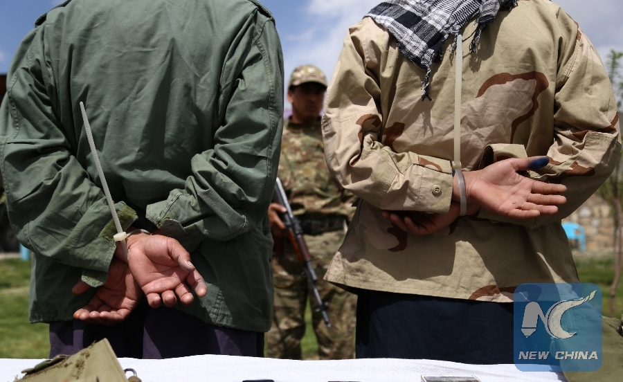 File Photo: Suspected Taliban militants stand hand cuffed after being arrested in Ghazni city, capital of Ghazni province, Afghanstan, April 10, 2018. (Xinhua/Sayed Mominzadah)