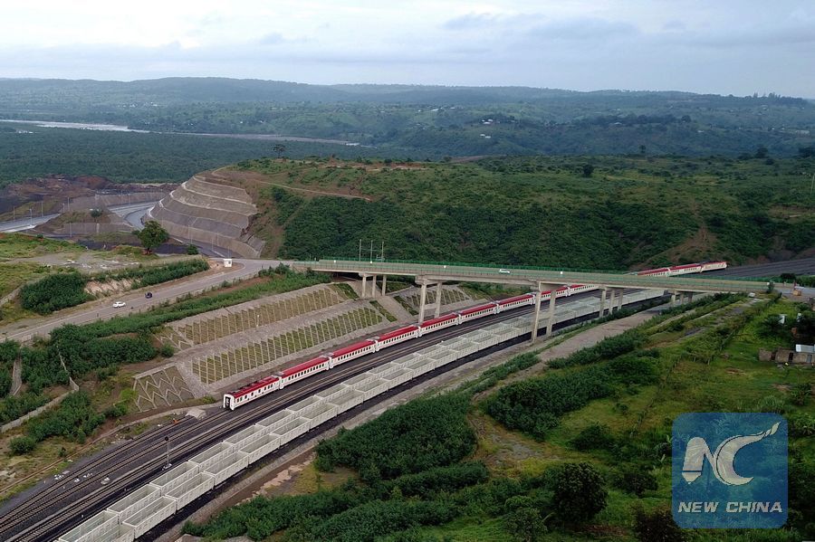 Aerial photo shows a train running on the Chinese-built Mombasa-Nairobi Standard Gauge Railway in Kenya. (Xinhua/Wang Teng)