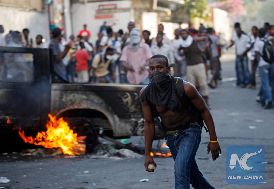 The file photo shows that a masked protester holds a stone near a burning vehicle during a protest in Port-au-Prince Feb. 4, 2015. (REUTERS Photo)