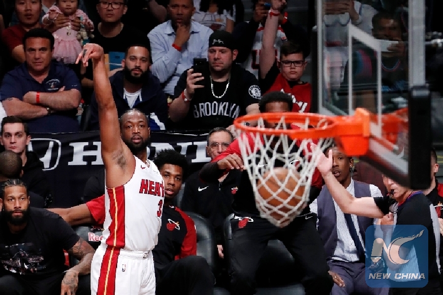 Dwyane Wade shoots at Brooklyn Nets's 113-94 home victory over Miami Heat on April 10, 2019. (Xinhua/Li Muzi)