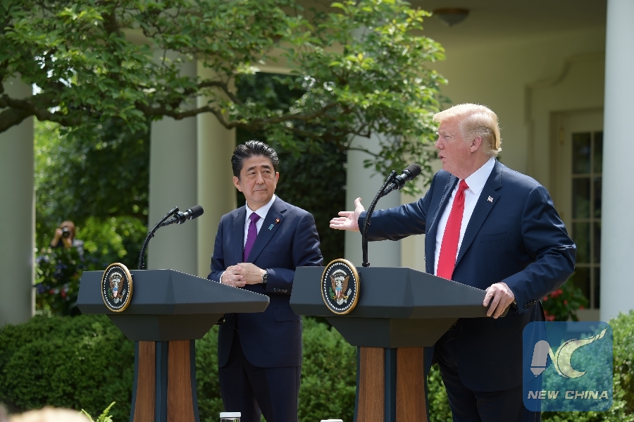 U.S. President Donald Trump (R) and Japanese Prime Minister Shinzo Abe attend a joint press briefing at the White House in Washington D.C., the United States, on June 7, 2018. (Xinhua/Yang Chenglin)
