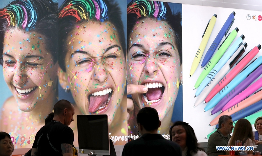 Visitors and exhibitors are seen during the Hong Kong Gifts & Premium Fair 2019 in south China's Hong Kong, April 27, 2019. Over 4,000 exhibitors attend the fair, which kicked off here on Saturday and will last till April 30. (Xinhua/Li Gang)