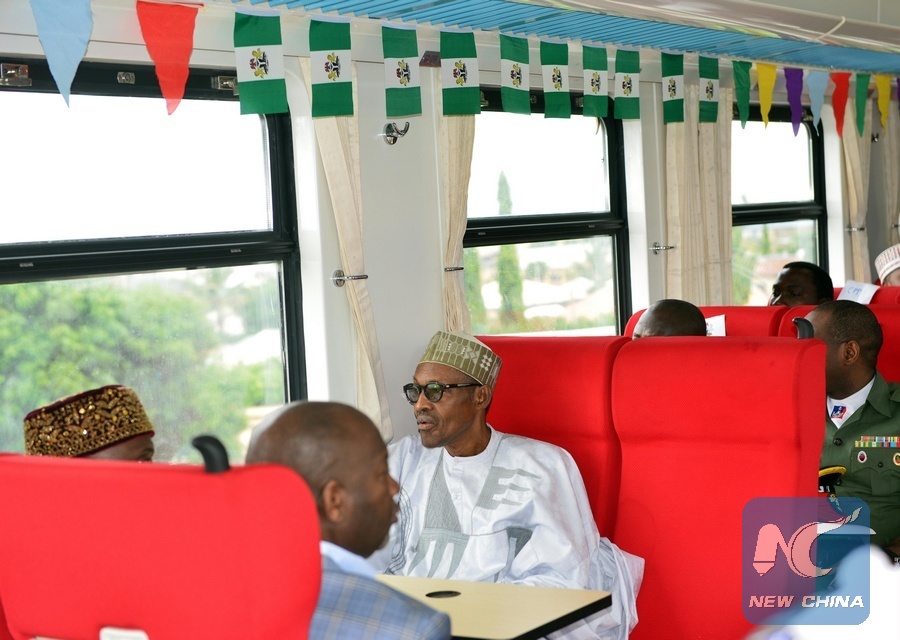 Nigerian President Muhammadu Buhari (C) sits in a passenger coach at a train station in suburban Abuja, on July 26, 2016. Nigeria marked a symbolic progress of railway service when its first completed standard gauge railway modernization project assisted by China, was open for commercial operation. With nine stations and a design speed of 150 km per hour, the Abuja-Kaduna rail line covers a distance of 186.5 km. (Xinhua/Yang Hongjie)