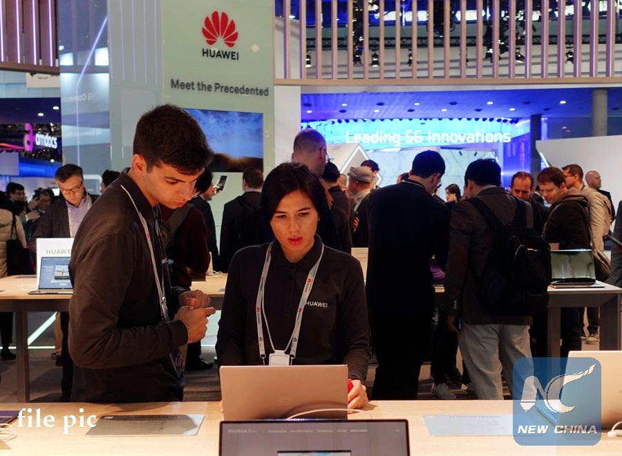 People are seen at the booth of Chinese tech company Huawei at the 2019 Mobile World Congress (MWC) in Barcelona, Spain, Feb. 25, 2019. The four-day 2019 MWC opened on Monday in Barcelona. (Xinhua/Guo Qiuda)