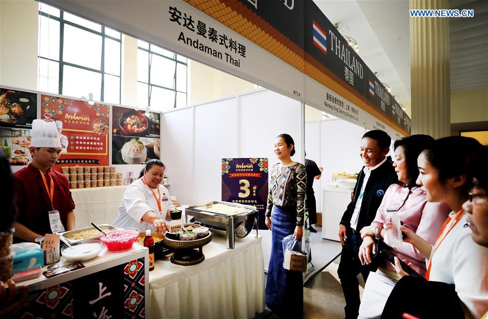 Chefs from Thailand demonstrate Thai cuisine cooking in Shanghai, east China, May 31, 2019. The Belt and Road Brand Expo 2019 kicked off at Shanghai Exhibition Center in Shanghai Friday. (Xinhua/Fang Zhe)