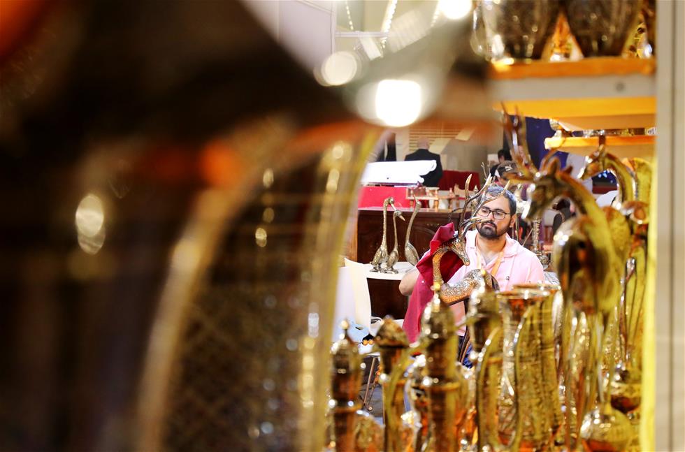 An exhibitor from Pakistan cleans brassware in Shanghai, east China, May 31, 2019. The Belt and Road Brand Expo 2019 kicked off at Shanghai Exhibition Center in Shanghai Friday. (Xinhua/Fang Zhe)