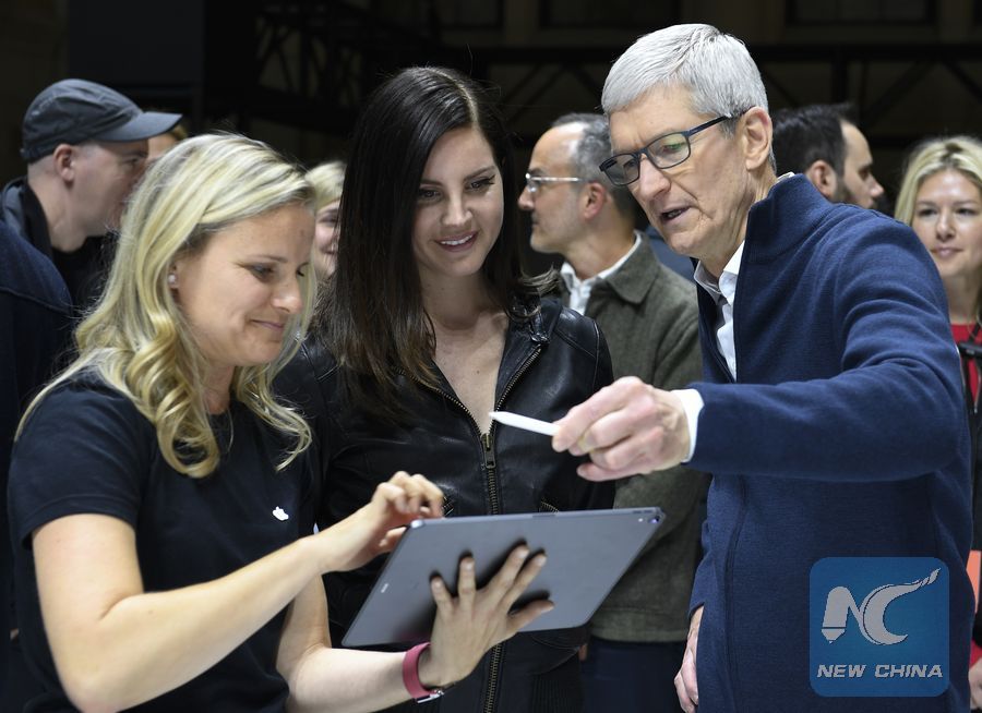 Apple CEO Tim Cook (R, Front) attends an event to unveil new Apple products in Brooklyn, New York, the United States, on Oct. 30, 2018. (Xinhua)