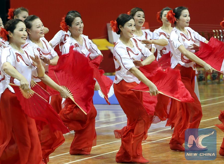 A group of damas - refering to the burgeoning legions of usually middle aged women, suddenly walked on the court with vivid red and pink fans, and gave an incredible performance of "guangchangwu," which means square dance in Chinese.