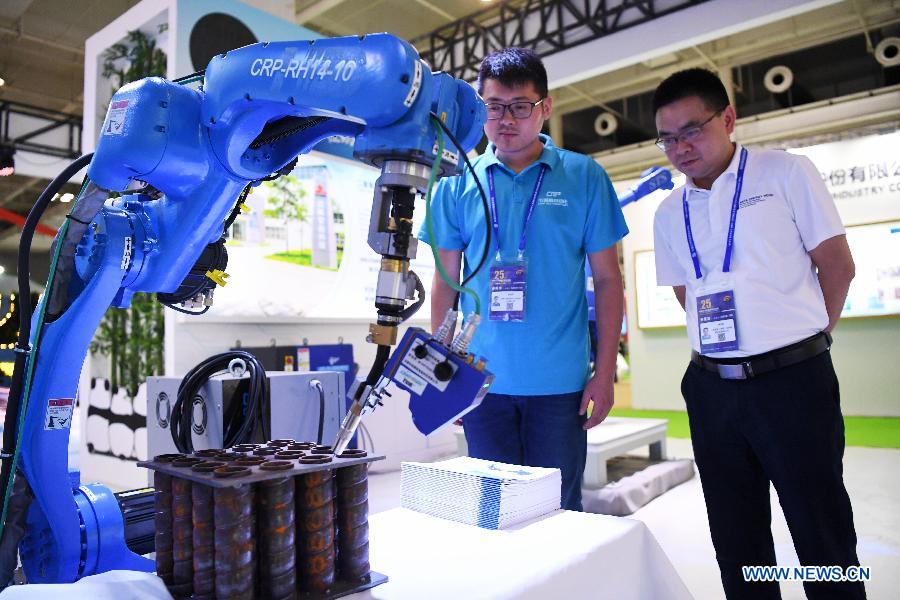 Guests watch a welding machine during the Lanzhou Investment & Trade Fair in Lanzhou, capital of northwest China's Gansu Province, July 4, 2019. The fair opened here on Thursday, and will last for five days. (Xinhua/Chen Bin)