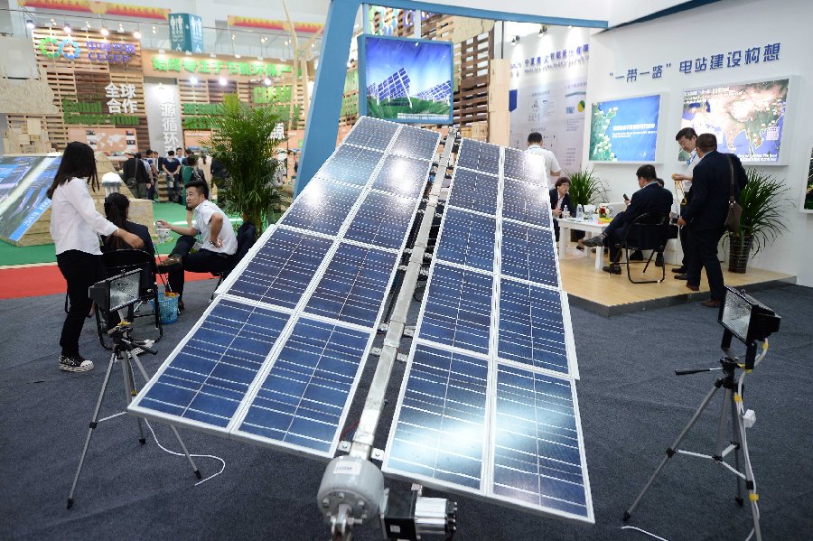 A photovoltaic solar panel is displayed during the China-Arab States Expo in Yinchuan, capital of northwest China's Ningxia Hui Autonomous Region, Sept. 11, 2015. (Xinhua/Wang Peng)